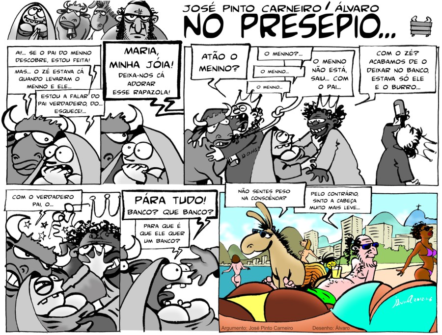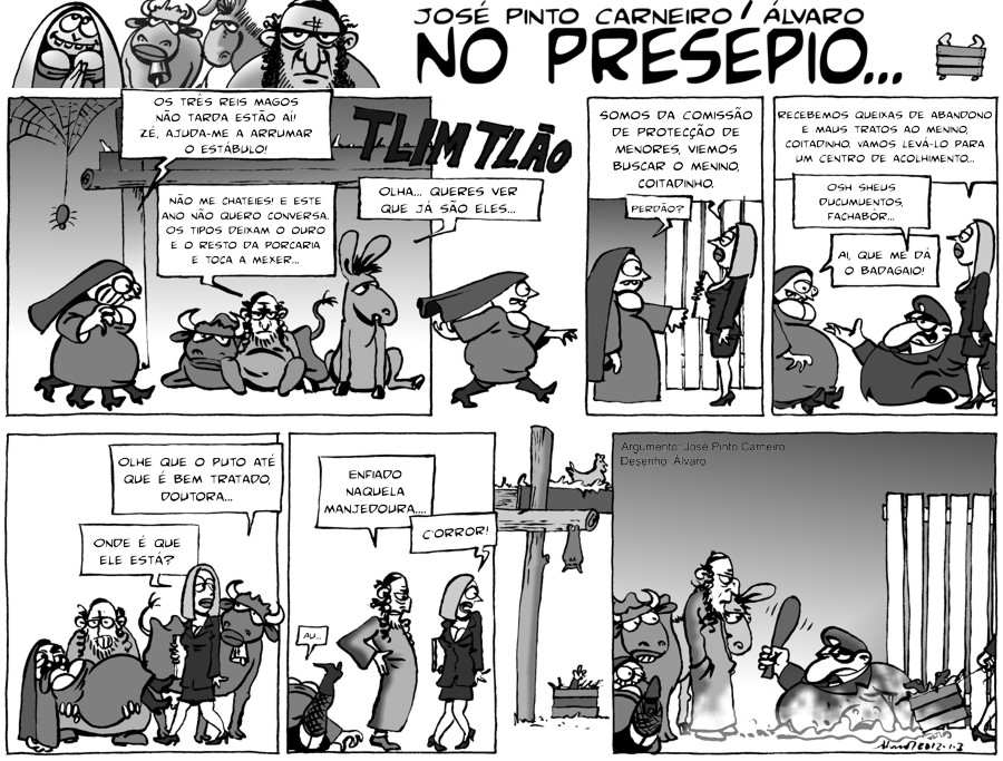 É com este texto que a editora Insónia apresenta o álbum No Presépio…, de José Pinto Carneiro e Álvaro, distinguido com o Prémio Nacional de Banda Desenhada para o Melhor Álbum de Tiras Humorísticas. (...)"O Presépio é tão bonito, tão inspirador. É uma representação pura da paz, do amor, dos valores fundamentais da vida em comunidade. Mas isso é porque os elementos que compõem esse presépio estão sempre calados e normalmente são de barro. Eis, na Banda Desenhada “No Presépio…”, o verdadeiro e genuíno presépio vivo. O Zé, a Maria, o Burro, a Vaca e o Menino no seu quotidiano exuberante, dramático, corriqueiro, cómico, parvo… Principalmente parvo.